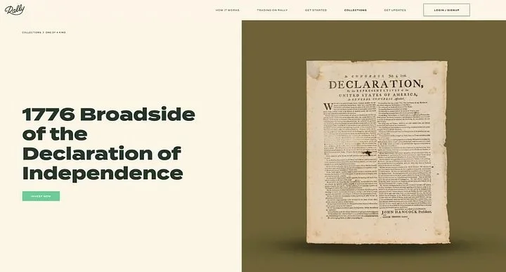 Rally Road is a new platform that offers people the opportunity to have fractional ownership in mostly physical (some digital) collectibles like sports cards, wine, cars, and a rare copy of the Declaration of Independence. I purchased 5 shares at $25/share for partial ownership of the $2M document.