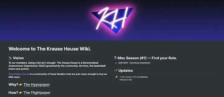 I was able to quickly identify two efforts focused on professional sportS: WAGMI United and Krause House. WAGMI (which is crypto slang for “we are gonna make it”) United is focused on purchasing an English soccer club (Bradford City specifically), while Krause House is generally focused on a small-market NBA team. Because I am more interested in basketball than soccer, I decided to focus on Krause House.